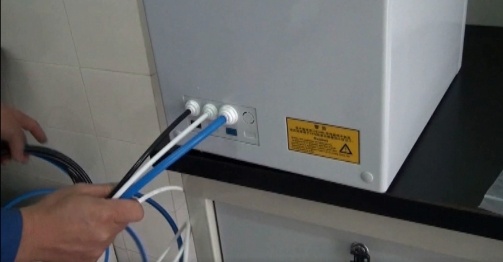 3.取下進水球閥上的鎖緊螺母,套在藍色PE管上,將藍色PE管套入球閥并旋緊鎖緊螺母。